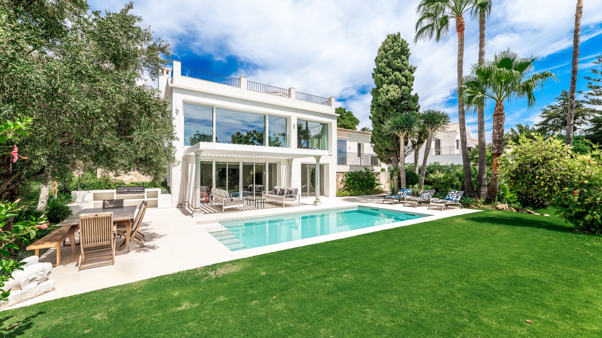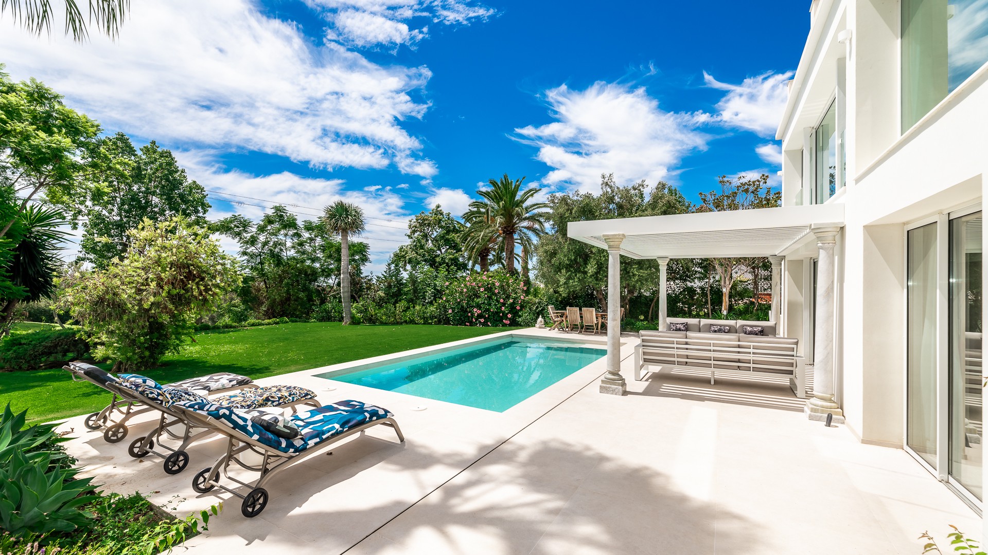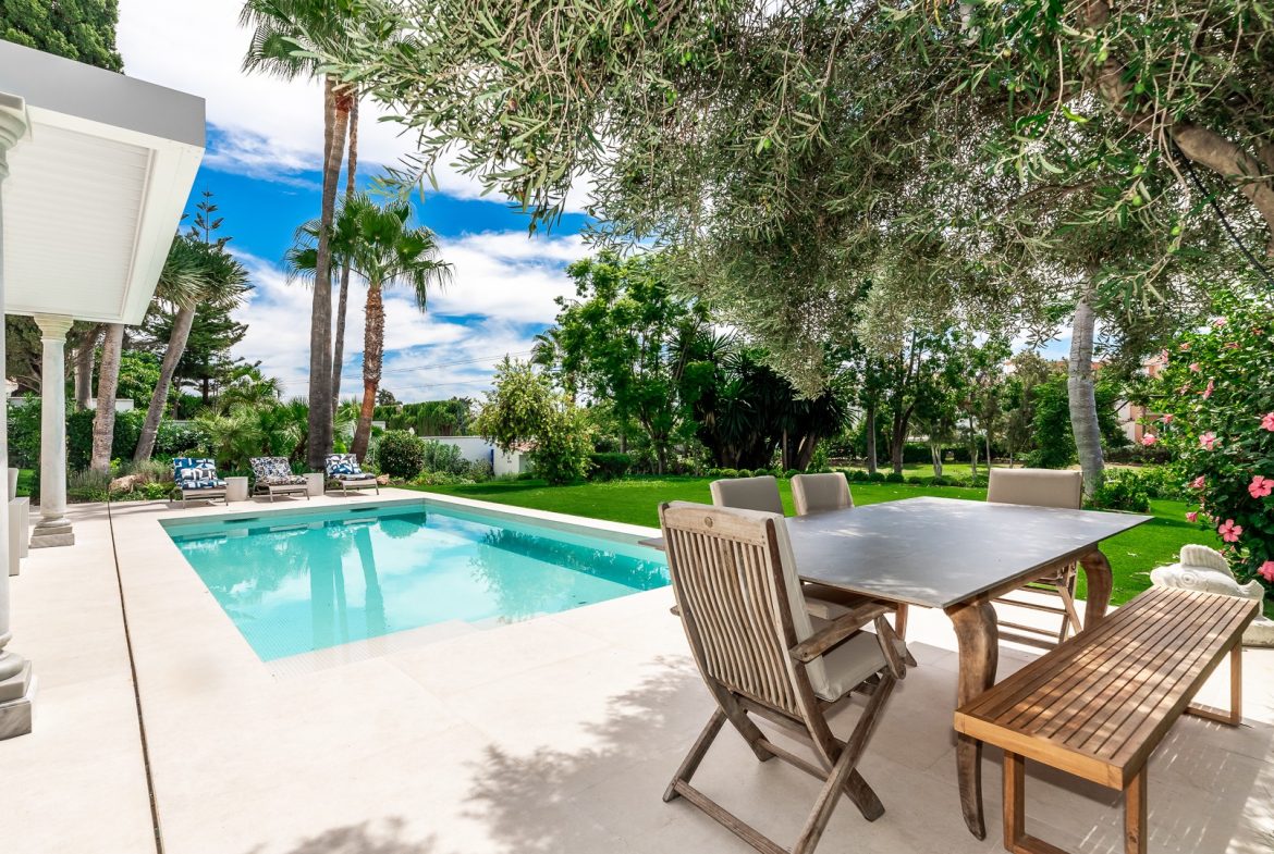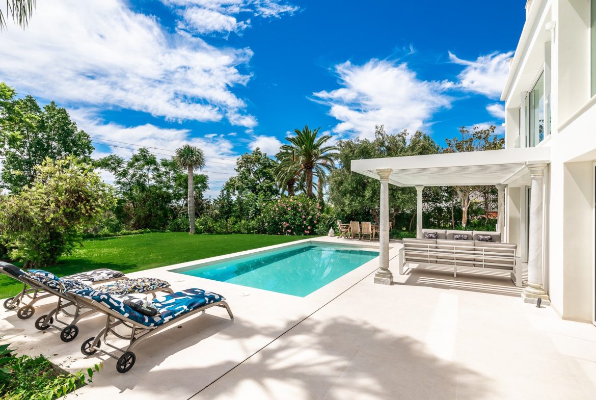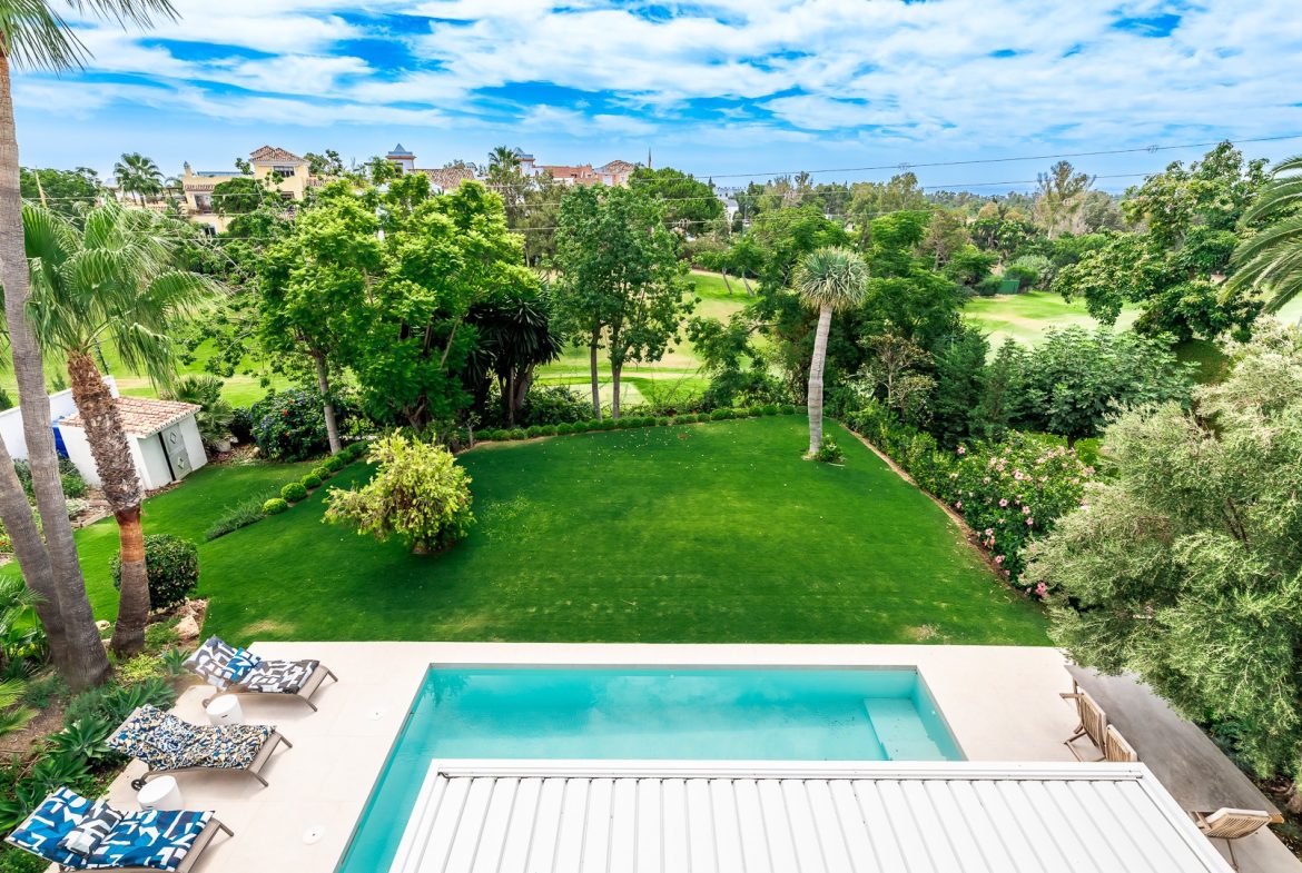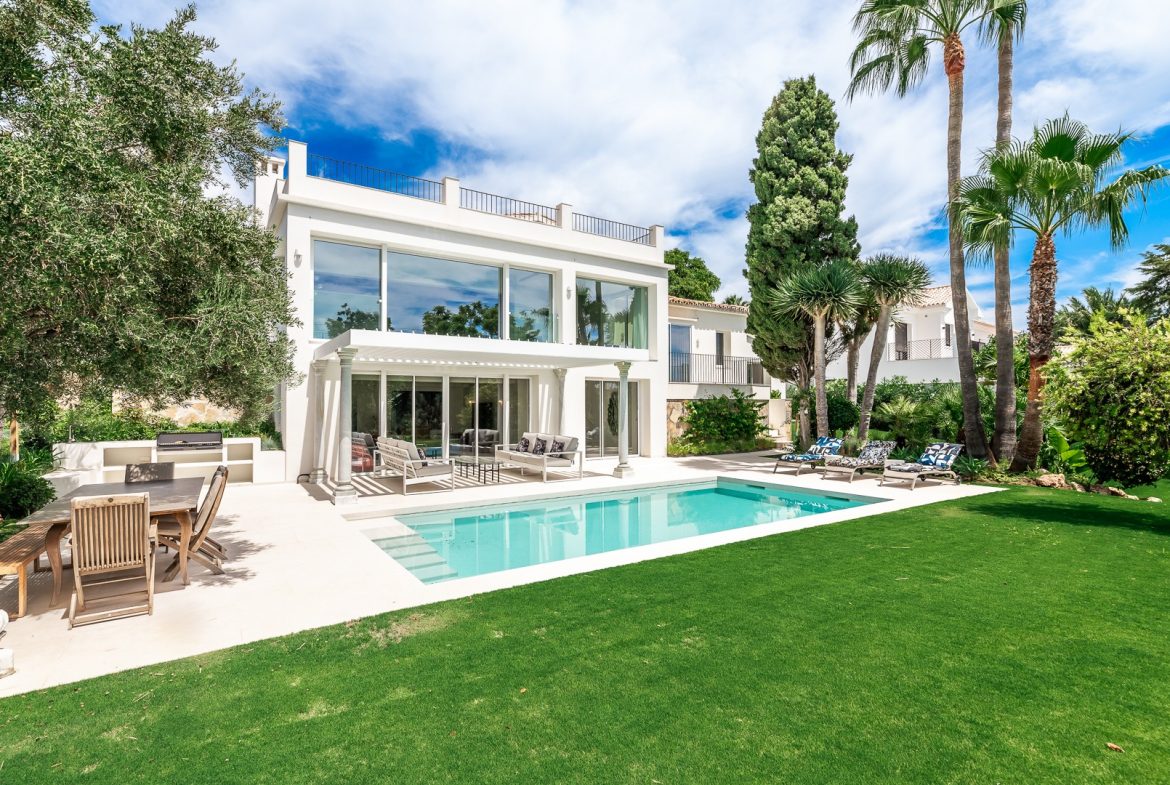 This lovely villa with stunning first-line golf views is located just a stone’s throw from Guadalmina Golf Club and 3 km from the beach. Guadalmina is a peaceful urbanization with several golf courses, sports clubs and schools, as well as beautiful restaurants and shops. It is divided into two parts, both dominated by 18-hole courses, with parkland greenery that characterizes the area. The villa’s entrance is situated on the first floor and spans over two levels. Upon entering, there is a spacious entrance hall that leads to a comfortable sitting room and an adjoining dining room. The kitchen is fully equipped with modern appliances, including an American-style salon and dining area. Additionally, there is a guest toilet on this floor. A double bedroom with its own bathroom can also be found on this floor. Moving to the lower level, which is at the garden level, there are three double bedrooms, each with access to the garden and swimming pool. One of the bedrooms has an en-suite bathroom, while the other two share a bathroom. The lounge area opens up to a large covered terrace with a spacious dining area, creating a perfect setting for outdoor cuisine while enjoying the picturesque surroundings. The swimming pool with roman steps and a pool shower is heated and has a saline solution. Other features include hot and cold air conditioning and wireless internet access in all rooms. There is also parking for up to four cars. Furthermore, it is just a 5-minute drive from Puerto Banús and about 15 minutes from the center of Marbella. This is a unique opportunity to own a property in one of the most prestigious urbanizations in the area!